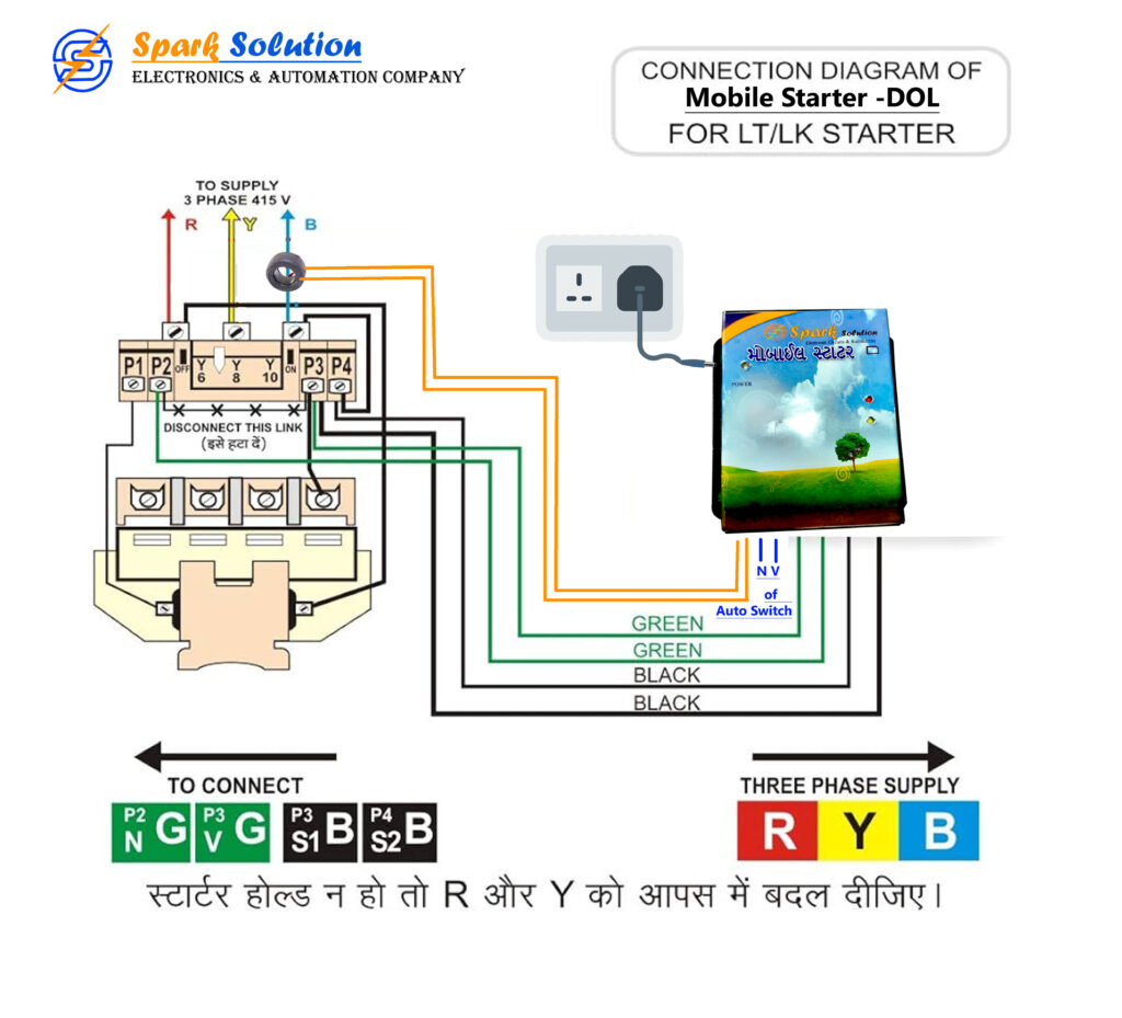 After inserting SIM card into slot, It is time to give power supply to mobile starter of spark solution with adapter of 5V or 12V whichever has been comes along with system. Take supply from any one phase and neutral/ground or earthing to give power to system at farm. (Image as per below)